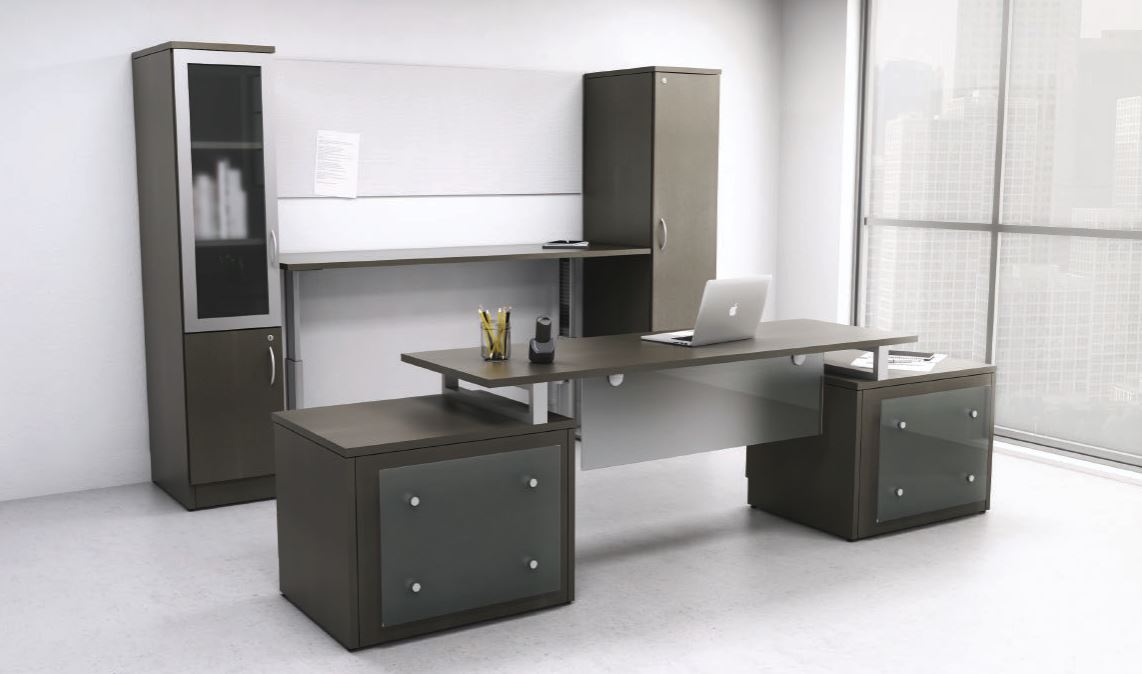 Built-in left and right storage cabinets provide ample space for files, office supplies, and personal items. Frosted glass fronts add a contemporary, executive-level finish while maintaining a clean and organized appearance.